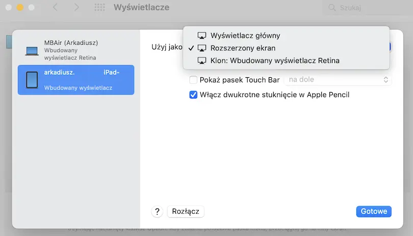 Korzystamy z ustawienia Wyświetlacze w Preferencjach. Dodajemy iPada, jako dodatkowy wyświetlacz.
