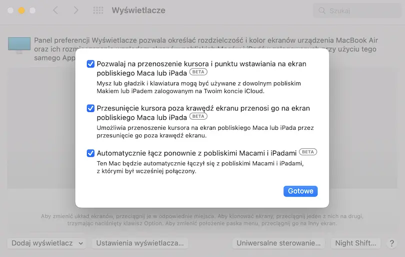 W opcji Uniwersalne sterowanie możemy ustawić opcje dotyczące kursora i jego pracy. A także ustawić automatyzację połączenia Maca i iPada. Również możemy zautomatyzować łączenie się urządzeń, gdy są obok.
