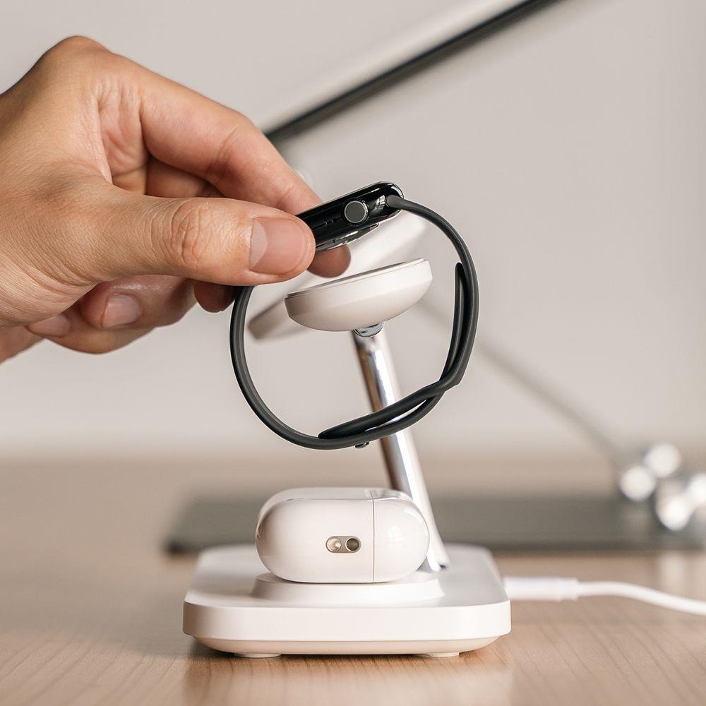 Ringke 3in1 Qi2 Magnetic Magsafe Wireless Charging Stand to idealne rozwiązanie dla użytkowników szukających eleganckiego i wszechstronnego urządzenia do ładowania. Dzięki kompatybilności z Magsafe, smartfonami wspierającymi ładowanie bezprzewodowe, Apple Watch, Galaxy Watch, Galaxy Buds oraz AirPods, ładowarka spełnia potrzeby szerokiej gamy urządzeń. Stylowe wykończenie w kolorach bieli i połyskującego chromu doskonale komponuje się z nowoczesnym wnętrzem, jednocześnie wprowadzając ład i porządek dzięki eliminacji kabli.